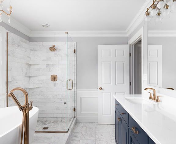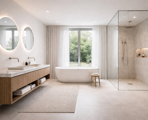 - Douche et baignoire : en verre, céramique ou design sur mesure.